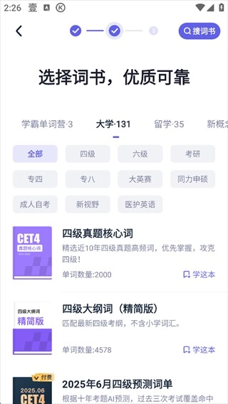 1、完美万词王这里更新的单词词库也是非常多的,能满足多种不同的年级的学生去学单词;