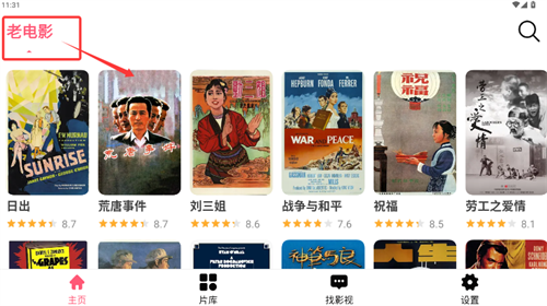 2、进入主页面,可浏览老电影等板块展示的影片内容。