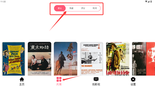 3、点击底部片库,可根据热度或评分等条件筛选影片。