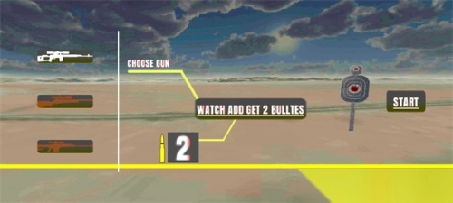 3、游戏开启后,留意右侧靶标,点击“START”按钮实施射击,此时剩余子弹数显示为2,务必谨慎对待每次射击时机。