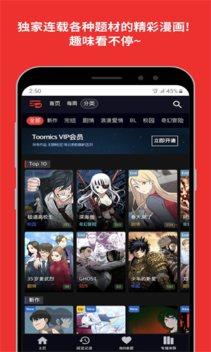 1. 丰富的漫画资源:toomics官方版提供了海量的漫画作品,包括完结、剧情、校园、奇幻冒险等多种类别,让用户可以根据自己的喜好选择喜欢的作品。