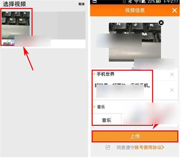3、在自己的手机里找到已经拍摄完成的视频,点击选中它,接着按照提示步骤填写好视频的标题和介绍内容,填写完毕后点击上传按钮,之后只需耐心等待审核结果即可。