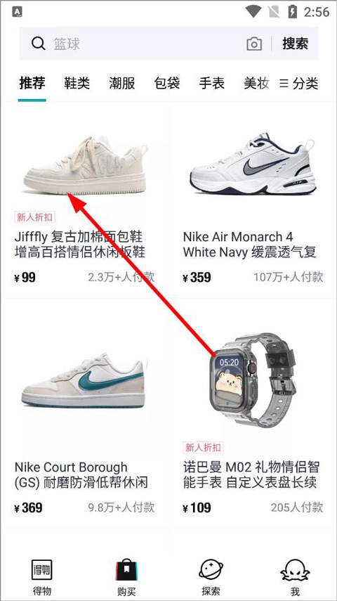 2、进入购买页面,有鞋类、潮服、包袋、手表等类目,用户选择自己要购买的物品,或者在上方搜索框输入关键词搜索,点击商品;