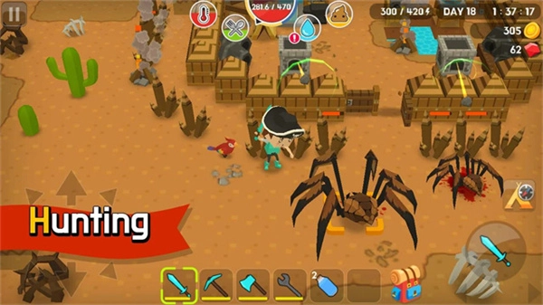 在这个游戏里,打猎算得上是最让人头疼的环节之一了。像鸡、猪、蜘蛛还有公鹿这类动物都会主动攻击人,而兔子、松鼠、母鹿和梅花鹿又跑得特别快,很难直接追上。不过这时候陷阱就能帮上大忙了。要是遇到蜘蛛,你可以在它附近布下一个陷阱,等它开始追你,你就赶紧躲开,它自己就会一头扎进陷阱里。对付其他动物的话,更简单——直接把光标对准它们所在的位置放下陷阱,这些动物就会自己往陷阱里钻,你只需要等着捡肉就行啦。