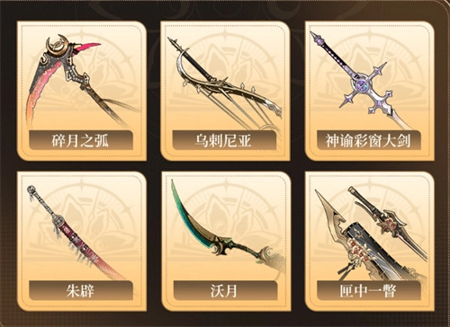 2、可选五星武器:碎月之弧、乌刺尼亚、神谕彩窗大剑、朱辟、沃月、匣中一瞥