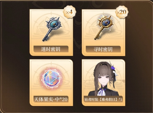 1、奖励:迷时密钥×4、寻时密钥×20、天体果实·中×20、铂鸢时装【雅弗假日】×1