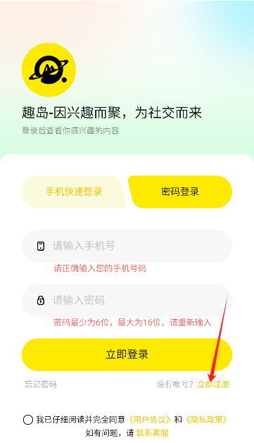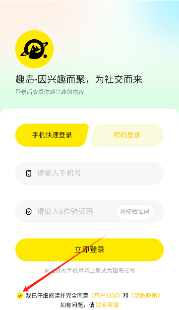 1、启动趣岛应用,仔细阅读并同意趣岛平台的用户协议与隐私政策;