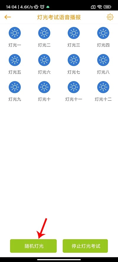 5、以“灯光模拟”考试为例,点击“练车”页面的“灯光模拟”,即可进入下方页面,按下随机灯光按钮即可开始灯光考试;