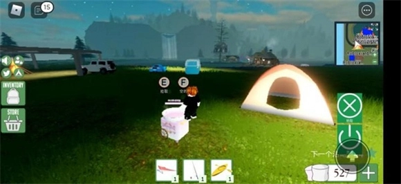 上方设有背包按钮,点击后可查看当前背包内的道具种类与数量;下方则是商城区域,在这里能够购买各式各样的物品,包括帐篷、车辆以及装备等。