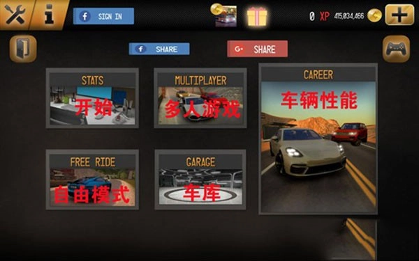 1、进入游戏后,会出现系统面板,分别代表了开始游戏、多人游戏、自由模式、车库、车辆性能等