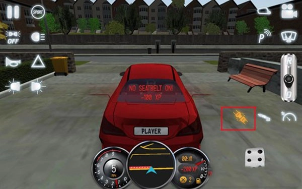 5、驾驶车辆的时候,如果已经有驾照的朋友们应该知道,首先要做的就是系安全带,在屏幕右下角安全带图标成黄色灯,表示安全带没有系好,我们要点击它系好安全带。如果不系安全带,屏幕中会提升我们减去100的经验值