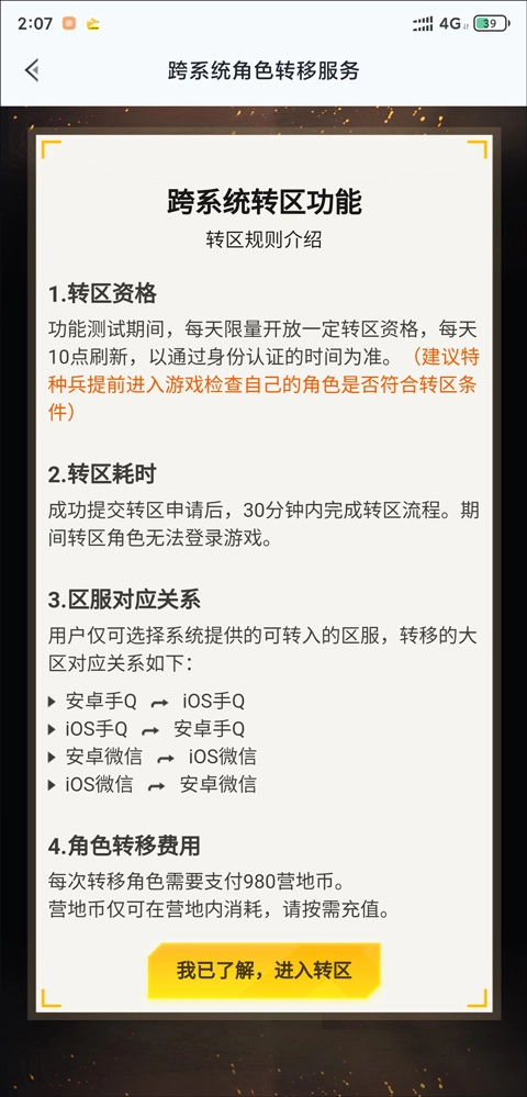 4、进入到系统转移流程,仔细阅读系统角色转移服务,然后点击“我已了解,进入转区”按钮