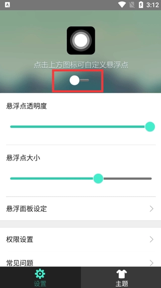 2、在设置页面里,你可以对悬浮点的透明度和大小进行调整;图标下方设有一个按钮,通过它能开启或关闭悬浮窗;直接退出应用也能关闭悬浮点,另外还可以给小白点更换主题颜色。