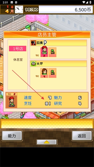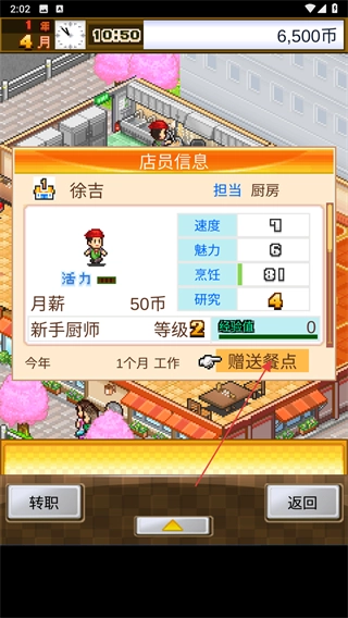点击店员可以通过赠送餐点提升其能力与等级,也可以点击下方的转职按钮为店员转职。