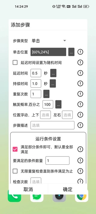 3、出现浮窗后,将触控精灵移至后台,对其需要的应用进行操作,这里有两种流程方法,一种是比较简单的录制功能,一种是比较复杂的手动进行添加步骤,小白用户推荐第一种方案,这里也是简单介绍第一种使用方案
