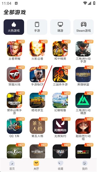 1、进入首页后,点击底部的大厅选项,可进入全部游戏选择页面。