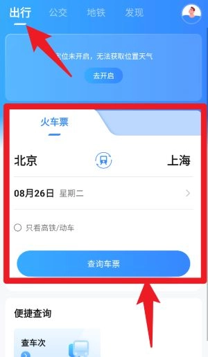 3、在出行页面中,输入出发地与目的地信息,选择乘车日期后点击查询车票即可查看列车信息。