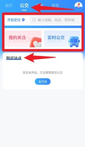 4、切换到公交页面后,输入路线或站点名,即可查看实时公交与附近站点等公共交通信息服务内容。
