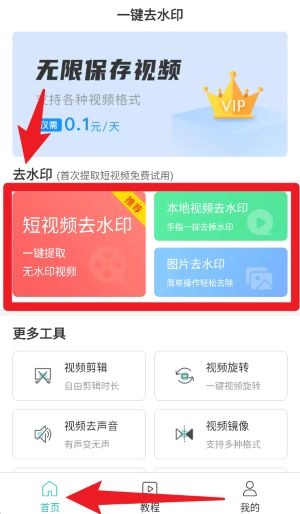 2、登录成功后自动进入首页,点击短视频去水印等按钮即可选择对应的去水印功能开始操作。