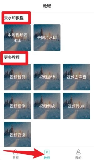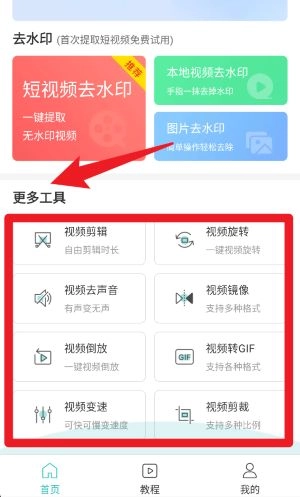4、点击底部教程页面,可查看详细的操作教学,如去水印、视频裁剪、GIF转换等功能指引。