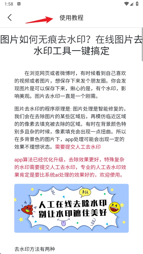 2、点击使用教程,可以查看详细的操作步骤和注意事项,帮助新用户快速掌握去水印和图片编辑的技巧。