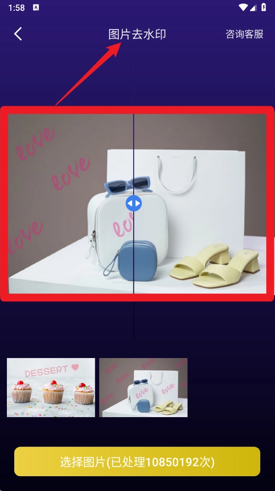 3、在图片去水印页面,上传需要处理的图片,软件会自动识别并去除水印,用户可对比前后效果。