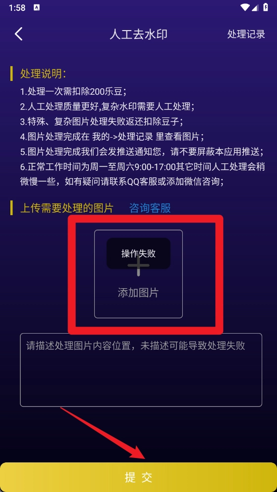 4、如果遇到复杂水印,可以选择人工去水印,上传图片并提交处理请求,由专业人工处理确保最佳效果。