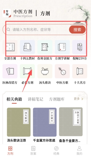 2. 使用处方功能时,您可以在搜索框中输入姓名或症状搜索。在页面底部,有分类推荐,如“十四五”计划教材和汤底韵,帮助你系统地学习。