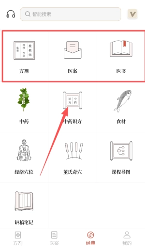 1. 登录软件后,可以在主界面上找到智能搜索。在这里,有各种各样的类别,如处方,中药,穴位。点击相应的图标即可进入学习区。