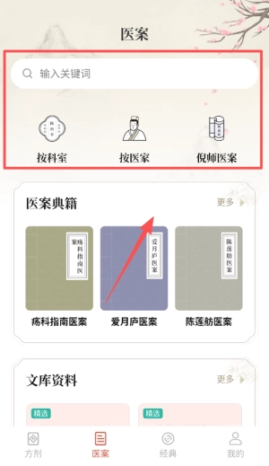 3. 在查看病例内容时,您可以按科室、医师或直接浏览倪石等经典病例。您还可以输入关键字,以精确过滤需要引用的案例。