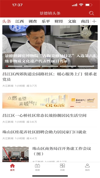 2、登录进入首页后,会呈现景德镇相关的头条资讯,还设有江西调查等频道分类,底部配有首页视频等功能导航栏,用户可通过这些浏览各类资讯内容。