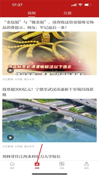 3、切换至视频页面,该页面分为视频与直播两大板块,集中呈现各类资讯类视频,同时清晰标注每条视频的发布主体、发布时间以及阅读量,用户点击视频即可观看对应的内容。