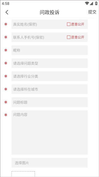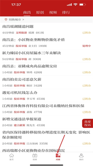 4、进入问政页面后,可通过切换城市来查看当地的投诉建议等信息,页面会展示各项事务的处理状态,用户还能点击“我要投诉”提交自己的相关诉求。