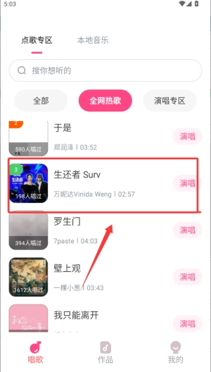 3、点击到喜欢的歌曲点击到演唱功能。