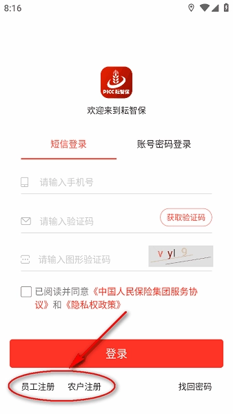1、打开耘智保后,员工和农户可以点击左下角对应的注册;