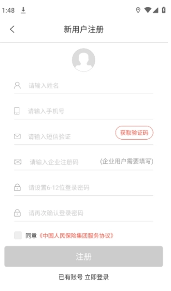 3、收到验证码后,在手机上输入,勾选“同意《中国人民保险集团服务协议》”,点击注册。