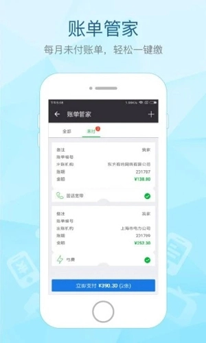 账单管家:智能识别待支付账单,便捷保存常用支付账单,支持合并支付多笔账单,有效预防账单逾期。