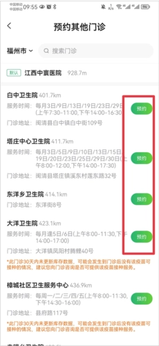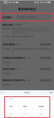 2、选择可预约的接种门诊地区,并点击预约