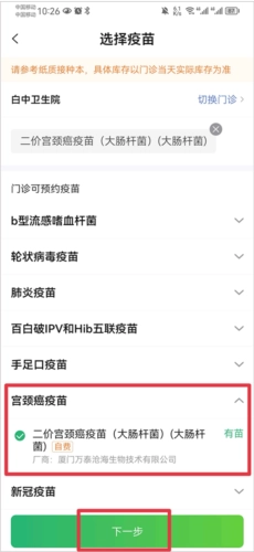 3、进入后,在选择疫苗页面中将页面下滑至底部,找到宫颈癌疫苗,然后勾选选项后点击下一步