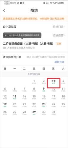 4、接着将在日历表中,点击显示有号的日期并选择具体的预约时间