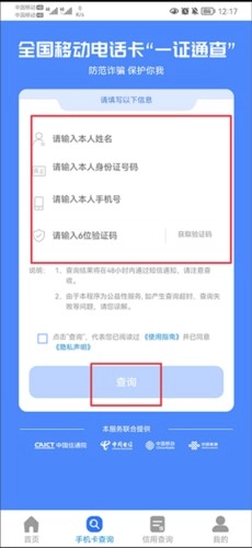 进入一证通查页面,在手机卡查询的界面里依次填写姓名、身份证号码、手机号码和验证码,然后点击查询按钮。