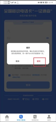 确认姓名和证件号无误后点击提交按钮(提示:由于系统资源限制,同一用户每24小时仅能进行一次查询操作)