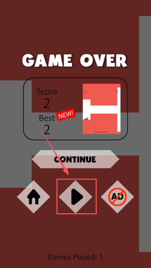 4、结束游戏:当界面显示“GAME OVER”时,点击“CONTINUE”继续或观看“AD”复活。