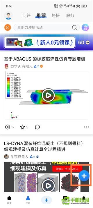 2、这里可以查看别人发布的内容,点击右下角的【+号】