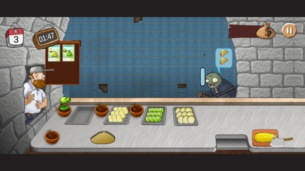 还有一个吃霸王餐的顾客,吃完就溜走了。不过他没上一个那么讨厌,在他逃跑的时候打爆他的僵尸头,他就会给你一颗钻石。