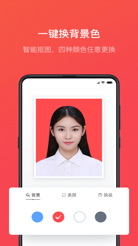 4、颜值由你掌控,轻松制作超美的证件照,支持美肤、更换蓝/红/白色背景,小白模式一键搞定。