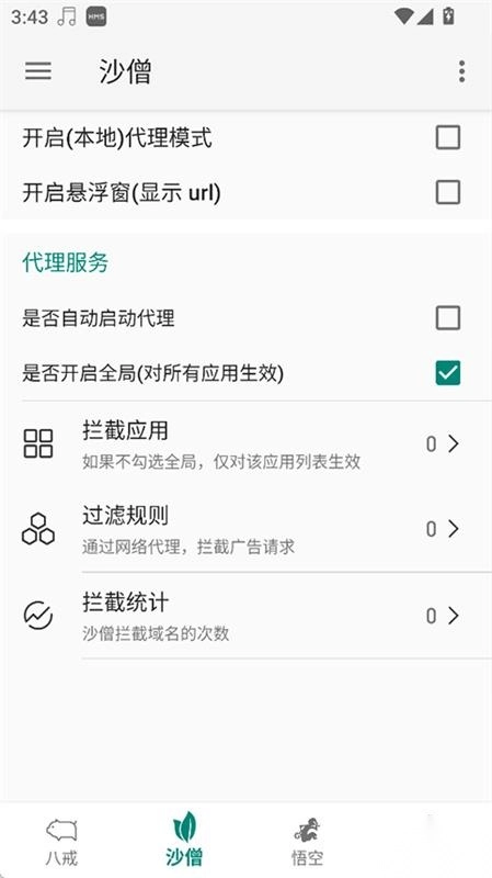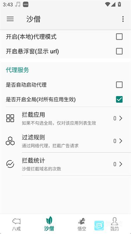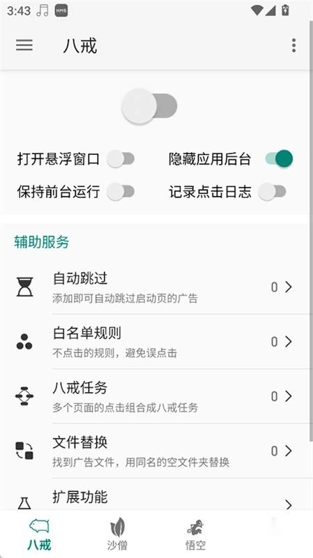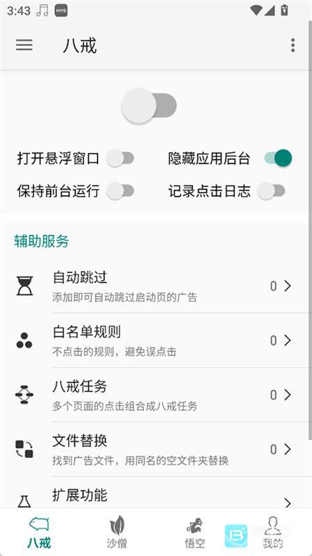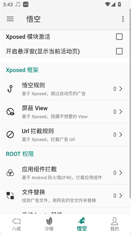 集成八戒、沙僧、悟空三大去广告模式,支持同时开启,全面拦截弹窗广告、摇一摇广告、跳转广告、开屏广告等多种类型。