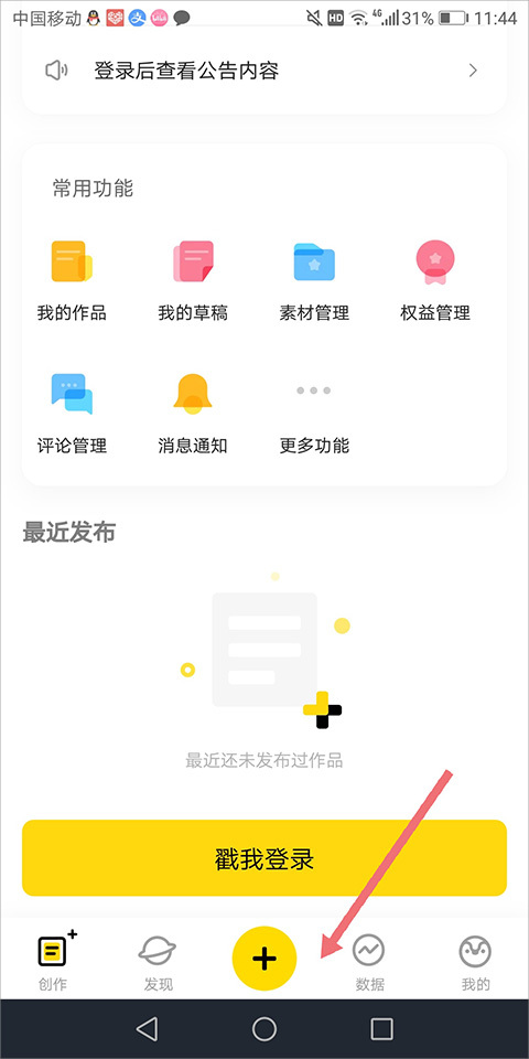 1、上传:把视频上传到服务器的操作步骤是,先打开并登录企鹅号,进入主页面后点击底部的加号按钮,就能启动上传流程了。