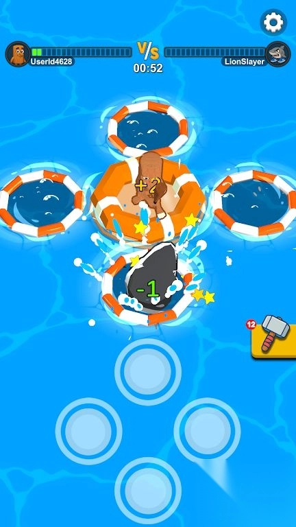1在游戏中,两名玩家同时参与。通过操控上下左右四个按键,击打从水面随机冒出来的鲨鱼,最终击中次数更多的玩家赢得胜利。
