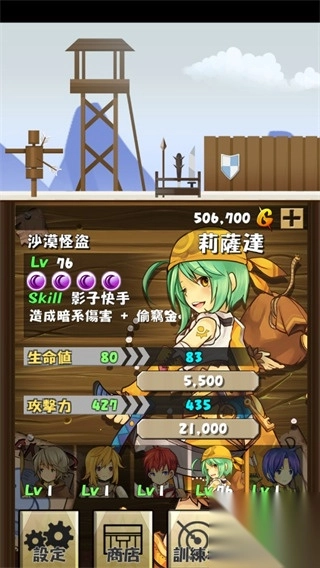2、在角色界面,查看“莉莲達(沙漠怪盜,Lv76)”的属性,通过升级来提升攻击力(例如435)与生命值,进而增强战力。